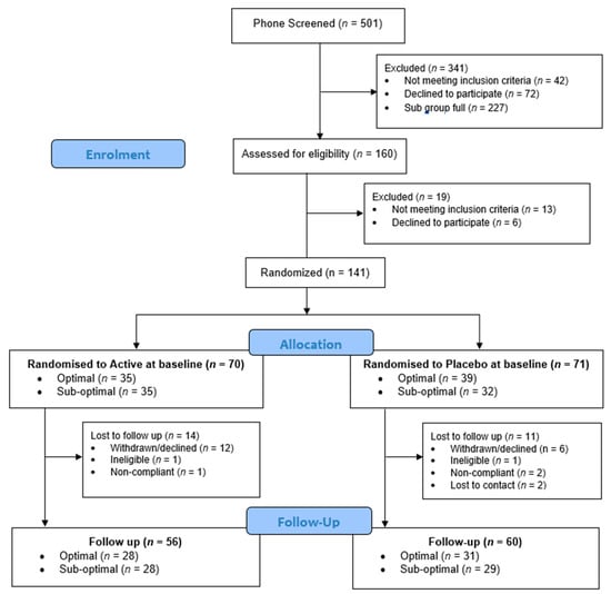 One hundred and forty-one participants completed baseline assessments and were randomized to active supplementation (n = 70) or placebo (n = 71). While the study aimed to recruit 50% with a ‘sub-optimal’ diet, challenges with recruitment resulted in the cohort comprising slightly more ‘optimal’ diet participants (n = 74) than ‘sub-optimal’ (n = 67), see []. Importantly, allocation to active supplementation and placebo groups remained balanced across diet subgroups.