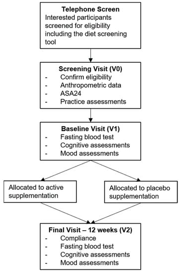 The baseline visit was scheduled within 2 weeks of their screening visit. Prior to this visit, participants were instructed to fast from 10 pm the night before, and to abstain from alcohol and caffeine 12 h before the visit. While fasted, participants had a blood sample taken and were then provided with a standardised breakfast and short break. Participants then completed mood assessments (including stress reactivity), followed by cognitive assessments. Stress reactivity tasks were repeated following the cognitive assessments. At the conclusion of this visit, participants were dispensed their study treatment and a compliance log. The follow-up visit was scheduled 12 weeks ±3 days from the baseline visit. The 12 week visit followed the same procedure as the baseline visit with the following exceptions: upon arrival a count of the remaining tablets was used to calculate compliance and participants indicated whether they believed the study tablets they had been taking contained the active supplementation or placebo. At the 12 week visit they also completed an additional ASA24 recall, identical to the one they completed between their screening and baseline visits. An outline of study assessments included in this paper are displayed in Figure 2.