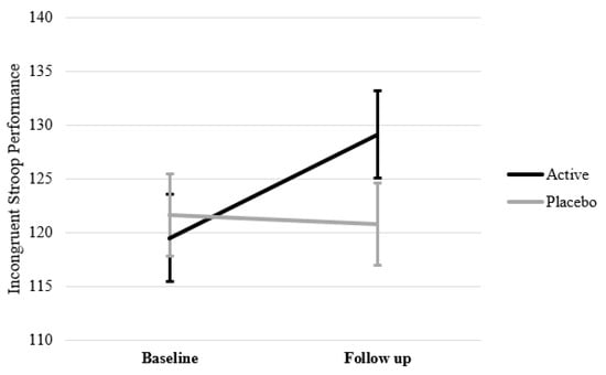 Incongruent Stroop Performance (Attention) in individuals with an ‘optimal’ diet at baseline and follow up (12 weeks) after adjusting for age, gender, education, BMI, BDI-II and brachial blood pressure.