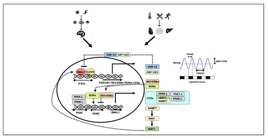 A parallel secondary loop exists that improves the robustness of the primary loop, consisting of the transcriptional factors nuclear receptor subfamily 1, group D, member 1 (NR1D1 gene producing a protein called REV-ERBα) and retinoic-acid-receptor-related orphan receptor α (RORα). The transcription of these genes is also activated by CLOCK-BMAL1 through binding to the E-box element in their promoters. REV-ERBα and RORα then compete to bind to the ROR element (RORE) in the BMAL1 promoter and regulate BMAL1 transcription; REV-ERBα suppresses while RORα stimulates BMAL1 transcription. Two other members of the nuclear receptor family, peroxisome proliferator-activated receptor α (PPARα), and PPARγ coactivator 1α (PGC1α) are activated by CLOCK-BMAL1. Interestingly, PPARα and PGC1α also activate BMAL1 transcription (Figure 1) [19,20,21,22].