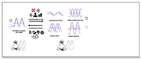 Master (blue) and peripheral clocks (pink) alignment is key to optimal metabolic health. Chronodisruption by various means leads to misalignment of circadian rhythms and has health consequences. Chrononutritional approaches have the ability to reverse deleterious chronodisruptive rhythms. The dotted line represents MESOR (midline estimating statistic of rhythm).