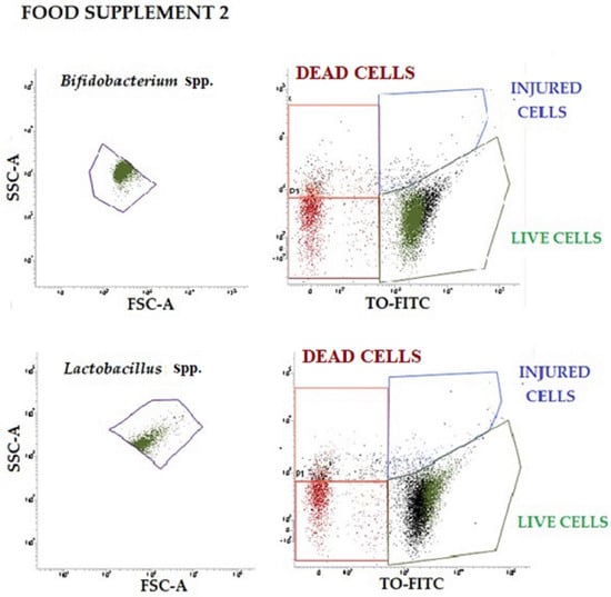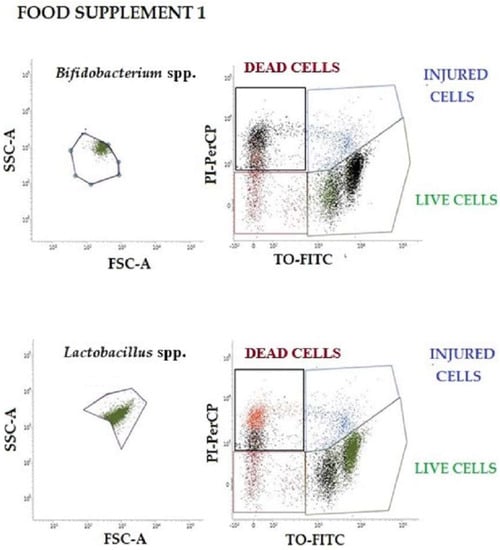 Two-color staining using the BD Cell Viability Kit (BD Biosciences, San Jose, CA, USA) was performed on all probiotic suspensions of food supplements 1 and 2 to distinguish between live and dead cells by flow cytometry. First, the appropriate dilutions of samples were incubated for 30 min in the dark with 42 µmol/L of TO and then an additional 30 min with 4.3 mmol/L of PI. Properly conjugated isotype-matched dyes and unstained bacterial samples were used as negative controls (the same bacterial cells incubated without any dye). Stained samples were analyzed employing a FACS Verse (BD Biosciences, San Jose, CA, USA) flow cytometer. A total of 10,000 events were acquired per sample using an automatic compensation tool []. Data were analyzed with the FACSuite™ (BD Biosciences, San Jose, CA, USA) software, in the “Acquisition-to-Analysis” mode. A forward scatter (FSC) vs. side scatter (SSC) plot with a physical gate was designed to identify the bacterial population of interest. Then, another specific region in the fluorescence parameter 1 (FL1 (TO)) vs. fluorescence parameter 3 (FL3 (PI)) plot was gated to display the live/dead stain results. To determine the absolute count, expressed as UFC/g, the following equation was used: