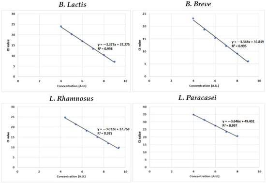 For the experimental set-up, optimization of assay parameters, such as primer concentration, annealing temperature, and amplification efficiency conditions, was performed. The specificity of primers was studied with other 3 distinct bacteria strains (no-probiotic DNA) and with the DNA of the other probiotic strains compounding food supplement mixture 1 and 2. For specificity testing, DNA concentrations in all samples were normalized to 10 ng/µL. The quantitative PCR experiment was conducted in triplicate using the protocol described previously in Section 2.6. Furthermore, sensitivity tests on serially diluted DNA concentrations were performed. The DNA-based sensitivity was tested by 6 tenfold serial dilutions starting from DNA extracted from 10 × 10−5 to 10 × 10−11. All tests were carried out in triplicate using the quantitative PCR protocol described above. The reaction efficiency was estimated by building reference standard curves obtained between the Ct values and logarithmic DNA dilutions. The linear regression was calculated using the QIA-quant software (Qiagen, Hilden, Germany). The slope and R squared values were computed using the same software as well.