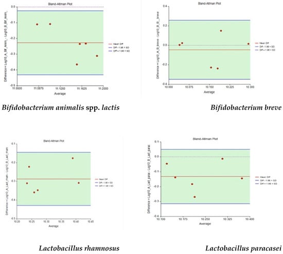 The Bland–Altman plot (mean difference or agreement limits) has been used to compare two measurements of the same probiotic strain of food supplement 2 by RT-qPCR. For all probiotics (B. animalis spp. lactis, B. breve, L. rhamnosus, and L. paracasei) no outliers were found during the comparison of measurements, as reported in Figure 5. Data presented in each plot were distributed with random variability and demonstrated that the two methods could be equally applicable to all probiotics. Bias, in terms of mean difference and the limits of agreement, at the 95% confidence intervals for each quantity, were evaluated for every calculation.