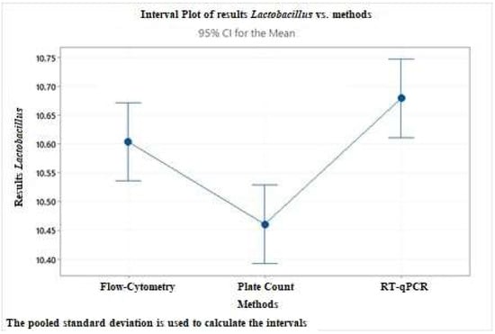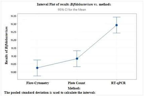 A one-way ANOVA test has been performed to establish the three methods’ agreement for Bifidobacterium spp. and Lactobacillus spp. counts. The following graphs (Figure 6 and Figure 7) are representative of the differences between Bifidobacterium spp. and Lactobacillus spp. estimation in food supplement 2 by the three methods.