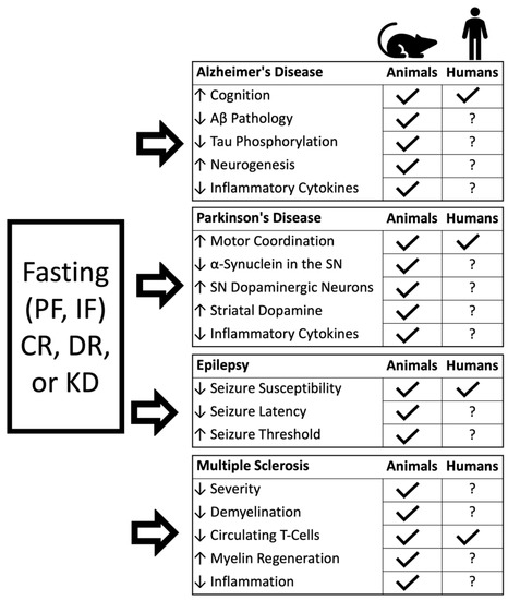 In this review we will discuss the effects of dietary interventions, with a specific focus on IF and PF, on various aspects of brain aging, as well as their preventive/therapeutic potential in animal studies and clinical trials of AD, PD, epilepsy, and MS (Figure 1). Although dietary interventions have been investigated in animal models of other age-related neurological diseases such as Huntington’s [26,27,28] and Amyotrophic Lateral Sclerosis (ALS) [29,30], only AD, PD, epilepsy, and MS have a comprehensive body of animal studies, as well as some clinical trials. While our review centers on IF and PF as therapeutic interventions, it is necessary to include studies investigating CR and DR, which may have similar mechanisms of action, and which in some cases may be the only dietary interventions attempted in human clinical trials.