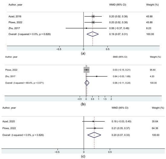 As shown in Figure 2a and Table 2, a pooled analysis from the three studies yielded a significant increase in an offspring’s weight at 1 year of age in the NNS group when compared with the control group: WMD in BMI z-score = 0.19 (95% CI: 0.07, 0.31), p-value = 0.002. No significant heterogeneity was found (p-value = 0.83, I2 = 0%). Table 2 also displayed the results for BMI z-score WMD in offspring at different ages: WMD = 0.06 (95% CI: −0.11, 0.24; p-value = 0.48) for offspring at birth (Figure 2b); WMD = 0.20 (95% CI: 0.07, 0.33; p-value = 0.002) for offspring at early childhood (Figure 2c); and WMD = 0.29 (95% CI: 0.12, 0.46; p-value = 0.001) for offspring at mid-childhood (Figure 2d). There was no significant heterogeneity observed for an offspring’s WMD at early childhood.