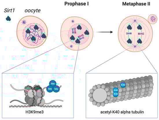 SIRT1 proteins are present in granulosa cells, follicular fluid, and also the oocyte [,]. Recently, the detailed temporal and spatial localization of SIRT1 during the maturation of the bovine oocyte was presented. At the germinal vesicle (GV) stage, SIRT1 is mainly localized within the nucleus []. Shortly after meiotic division resumes at the GV breakdown (GVBD) stage and as meiotic division progresses, SIRT1 expression levels increase, contributing to the presence of SIRT1 throughout the ooplasm []. Although changes in histone acetylation are constantly present during division, their intensity varies between phases, as shown in a mouse model []. Of particular interest seems to be the effect of SIRT1 on the course of metaphase I and II []. Several works have documented the focus of SIRT1 on a-tubules in metaphase I and II in mice and domestic cattle [,]. Accordingly, SIRT1 is involved in meiotic spindle patterning by modifying the level of the histone acetylation (Figure 2) []. This fact makes Sirtuin 1 an important activator of metaphase plate formation. Therefore, sirtuin inhibition in a healthy oocyte leads to the formation of abnormal spindles and misaligned chromosomes []. In addition, ample evidence supports the disruption of metaphase plaque formation due to oxidative stress [,,]. However, the SIRT1 signaling pathway can restore proper chromosome alignment in states of induced oxidative stress [,]. Reversal of division disorders occurs through the pathway between Sirtuin 1 and superoxide dismutase 2 (SIRT1/Sod2), and oocyte quality is improved and allows fertilization. Moreover, SIRT1 inhibition abrogates the positive effects of antioxidants that stimulate the SIRT1/Sod2 axis [,]. The SIRT1/Sod2 axis is preceded by the interaction of SIRT1 with the forkhead box transcription factor O3A (FOXO3A), reducing its acetylation []. In addition, FOXO3A has a regulatory role in the activation of primary ovarian follicles in collaboration with phosphoinositide 3-kinase (PI3K) [].