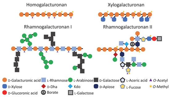 - Vincken, J.-P.; Schols, H.A.; Oomen, R.J.; McCann, M.C.; Ulvskov, P.; Voragen, A.G.; Visser, R.G. If homogalacturonan were a side chain of rhamnogalacturonan I. Implications for cell wall architecture. Plant Physiol. 2003, 132, 1781–1789. [Google Scholar] [CrossRef] [PubMed]