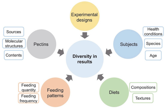 The results obtained from in vivo investigations provide additional information as to how pectin ingestion affects physiological responses of humans and other animals. Pectin’s in vivo effects are complicated by the inherent variability in animal experiments (Figure 2), for example species of subjects, design of experiments procedures, measurement methods, selection and quantity of pectins, and composition of diets.