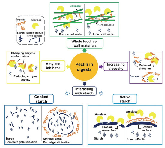 However, there is no recent review summarizing pectin’s effects on starch digestion (i.e., passage of amylolysis products through the gastrointestinal (GI) tract, absorption of glucose and the resulting postprandial blood glucose level), making the findings in this field difficult to integrate. Additionally, many previous studies ignored the importance of pectin’s structure-property relationships, leading to ambiguous or misleading conclusions. To help solve these problems, in this review we discuss how pectin affects the in vivo utilization of starchy food.