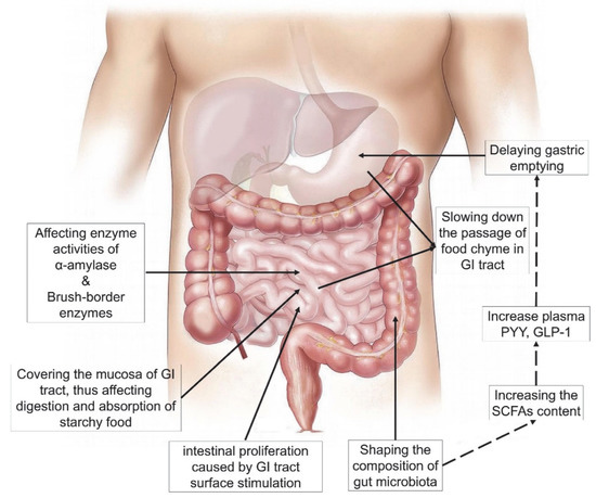 There are three major reasons for pectin’s decreasing effect on digestibility and BGL, as follows. (1) Pectin would normally increase the viscosity of digesta or food chyme, thus inducing a series of physicochemical and physiological changes; (2) pectin could interact with amylases and inhibit their activity; and (3) the ingestion and fermentation of pectin in intestines also regulate digestion-related in vivo physiological responses. In vivo, an increased viscosity of chyme or food bolus could prolong the transit time of food in the GI tract, which would delay gastric emptying [26,34,35,36]. Increased intraluminal viscosity also slows the absorption of nutrients in the intestine and affects the production of digestion-related hormones. Pectin gel that sticks on the surface of the GI tract can also lead to histological or morphological changes in the tract, affecting the intestinal absorption ability and amylase activities. Besides influencing amylase activity by differentiating the growth of enterocytes, pectins have also been found to inhibit the activities of starch-digestion related enzymes. Both pectin and amylase have abundant functional groups and can thus interact with each other via non-covalent intermolecular interactions. The fermentation of pectin in the intestine could also contribute to BGL regulation. Pectin, being an indigestible fiber, can only be fermented by gut microbiota, and thus the presence of pectin could (1) physically stimulate the distal intestines, (2) influence the growth and balance of microbiota and (3) promote the production of SCFAs during fermentation. The SCFAs partially influence the content of plasma digestive hormones, which are responsible for appetite, satiety and GE, and thus indirectly influence BGL fluctuations and in vivo digestion of food.