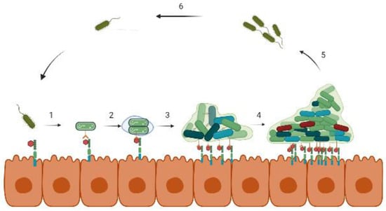 Stages of biofilm formation on a biotic surface. (1) Bacteria approach the host cells and bind to specific receptor proteins. (2) After binding, bacteria start multiplying and secrets EPS that (3) eventually forms the microcolonies, and (4) the biofilm develops into a more complex 3D structure. In (5) and (6), the cycle, thus, continues with the dispersion of bacteria from the biofilm.