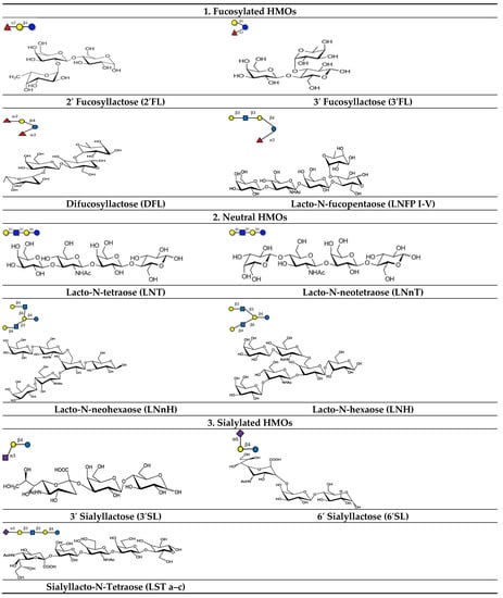 A lactose molecule forms the backbone of all HMOs [32,34]. The lactose residue is further modified by the addition of N-acetylglucosamine by β1–3 or β1–6 bonds. β1–3 linkages elongate the fundamental structure into linear patterns, whereas β1–6 bonds introduce branching. Two enzymes, namely fucosyltransferase and sialyltransferase, are involved in the alteration of the basic structure of HMOs. They catalyze the addition of fucose and/or sialic acid through alpha 1-2,3,4 and alpha 2-3,6 bond formation at the terminal position [50,51]. HMOs are broadly classified into three categories, fucosylated, sialylated, and neutral (Figure 3), based on the presence of sialic acid and fucose residues [52].