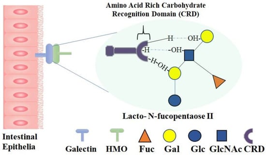 Galectins are small, soluble, beta-galactoside-specific lectins with conserved carbohydrate-recognition domains (CRDs) that are expressed on intestinal epithelia, immune cells, skeletal muscle, lymphoid tissues, the heart, kidneys, neurons, dendritic cells, etc. There are three types of galectins: prototype, chimera, and tandem galectins. In the CRD of prototype galectin, eight amino acids, namely His44, Arg48, Trp68, Val59, Asn61, Asn46, Glu71, and Arg73, are responsible for glycan binding. The OH groups at C-4 and C-6 of galactose and C-3 of N-acetylglucosamine of HMOs form hydrogen bonds with the amino acid residues of galectin in the CRD region (Figure 4). In tandem galectins, two CRD regions are present at the N and C terminus, separated by a short proline and glycine-rich peptide linker. HMOs containing a Galβ1–3GalNAc residue bind to the CRD at the N terminus of tandem galectins via the OH group. As galectins are involved in converting signals to cells and regulating cell functions, the binding of HMOs with galectins controls the interactions between galectins with ligands expressed in other cells. LNnT, LNT, LNFP-II, LNFP-III, and LNDFH are the common HMOs that bind with galectins 1,2,3,7,8,9 [58,59,60].