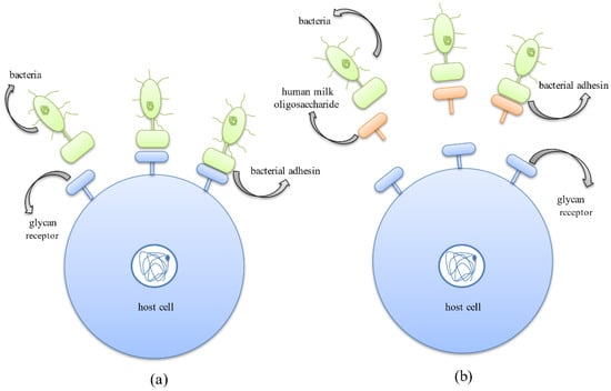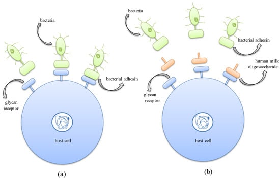 Anti-adhesive mechanism exhibited by human milk oligosaccharides where they compete with bacterial protein adhesins for binding to host cell surface glycan receptors. (a) Binding of bacterial protein adhesins to the host cell surface glycan receptors aiding successful colonization in the host system. (b) Binding of HMOs to host cell surface receptors thus inhibiting adhesion of bacteria to host cells and successfully preventing the occurrence of infection.
