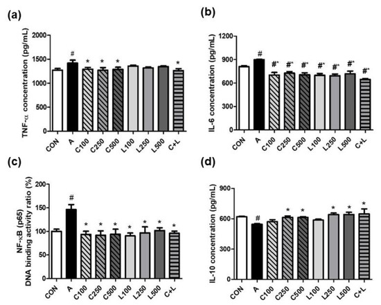 Effects of aspirin, CPC, and/or LBP on proinflammatory markers (a) TNF-α, (b) IL-6, (c) NF-κB (p65) DNA binding activity ratio, and anti-inflammatory marker (d) IL-10. CON: control group, A: aspirin-induced group, C: CPC treated group, L: LBP treated group. Data are mean ± SD (n = 3). # p < 0.05 compared with the CON group. * p < 0.05 compared with the A group.
