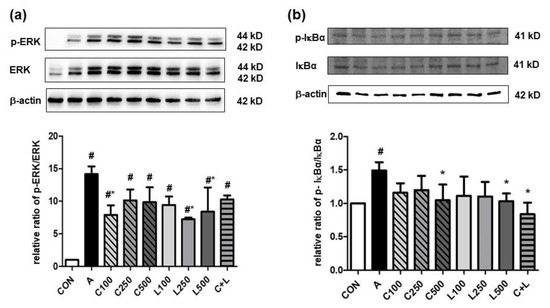 Aspirin significantly elevated the relative ratio of the phosphorylated extracellular signal-regulated kinase (p-ERK)/ERK (Figure 3a) and phosphorylated IκB-α (p-IκB-α)/IκBα (Figure 3b). However, the treatment of 100 μg/mL CPC or 250 μg/mL and 500 μg/mL LBP decreased the relative ratio of p-ERK/ERK, and a high dose of CPC or LBP (500 μg/mL) and C + L treatments significantly decreased the relative ratio of p-IκBα/IκBα.