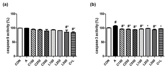 Effects of aspirin, CPC, and/or LBP on apoptotic markers (a) caspase 9 activity and (b) caspase 9 activity. CON: control group, A: aspirin-induced group, C: CPC treated group, L: LBP treated group. Data are mean ± SD (n = 3). # p < 0.05 compared with the CON group. * p < 0.05 compared with the A group.