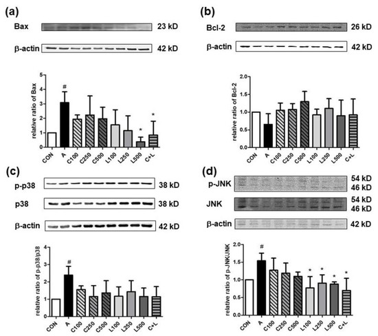 Effects of aspirin, CPC, and/or LBP on the relative ratio of (a) Bax, (b) Bcl-2, (c) phosphorylated p38 (p-p38)/p38, and (d) phosphorylated c-Jun N-terminal kinase (p-JNK)/JNK. CON: control group, A: aspirin-induced group, C: CPC treated group, L: LBP treated group. Data are mean ± SD (n = 4). # p < 0.05 compared with the CON group. * p < 0.05 compared with the A group.