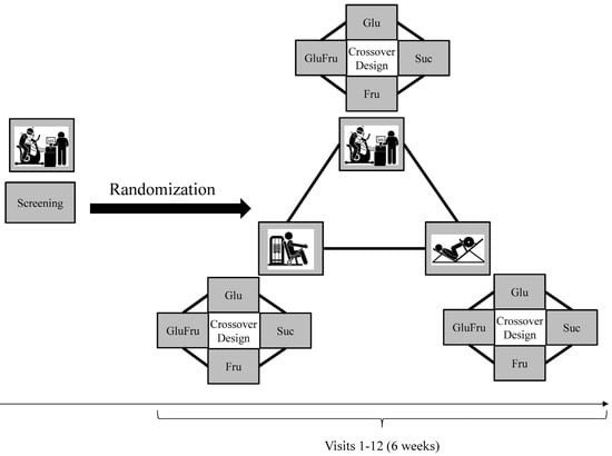 Study flow chart. Glu: Glucose, Fru: Fructose, GluFru: Glucose and fructose and Suc: Sucralose (placebo).