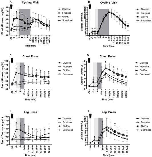 (A) Blood lactate during cycling study visits. Black circles indicate Glu. Open Squares indicate fru. Half open squares indicate GluFru. Open circles indicate sucralose. Light grey areas indicate warm up periods. Dark grey areas indicate exercise testing. † indicates statistical significance of Glu and GluFru compared to fructose and sucralose (p < 0.001). * indicates statistical significance between fructose and sucralose (p < 0.05), Stars indicate statistical significance of glucose compared to fructose and sucralose (p < 0.01). (B) Blood lactate during cycling study visits. † indicates statistical significance of Fru and GluFru compared to glucose and sucralose (p < 0.001). (C) Blood glucose during chest-press visits. † indicates statistical significance of Glucose and GluFru compared to Fructose and sucralose (p < 0.001). * indicates statistical significance between fructose and sucralose (p < 0.05), ** indicates statistical significance between fructose and sucralose (p < 0.01), *** indicates statistical significance between fructose and sucralose (p < 0.001). Stars indicate statistical significance of glucose compared to Glufru, fructose and sucralose (p < 0.05). (D) Blood lactate during chest-press visits. † indicates statistical significance of Fructose and GluFru compared to glucose and sucralose (p < 0.001). ** indicates statistical significance between glucose and sucralose (p < 0.01), *** indicates statistical significance between glucose and sucralose (p < 0.001). (E) Blood glucose during leg-press visits. † indicates statistical significance of glucose and GluFru compared to fructose and sucralose (p < 0.001). T indicates statistical significance of glucose compared to fructose, GluFru and sucralose (p < 0.01). ** indicates statistical significance of fructose in comparison to sucralose (p < 0.01). Stars indicate statistical significance of glucose compared to fructose, GluFru and sucralose. While fructose and GluFru are statistically different to sucralose (p < 0.05). (F) Blood lactate during leg-press visits. † indicates statistical significance of fructose and GluFru compared to glucose and sucralose (p < 0.001). T indicates statistical significance of glucose compared to fructose, fructose and glufru compared to sucralose (p < 0.05). Stars indicate statistical significance between fructose and sucralose (p < 0.05).