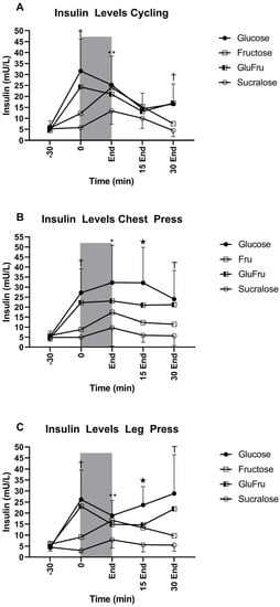 Black circles indicate Glu. Open Squares indicate fru. Half open squares indicate GluFru. Open circles indicate sucralose. Dark grey areas indicate exercise testing. (A) Insulin levels during cycling study visits † indicates statistical significance of glucose and GluFru compared to Fructose and sucralose (p < 0.01). ** indicates statistical significance of Glu, Fru, and GluFru compared to sucralose (p < 0.01). (B) † indicates statistical significance of glucose and GluFru compared to Fructose and sucralose (p < 0.01). * indicates statistical significance of Glu, Fru, and GluFru compared to sucralose (p < 0.01). Glu is significantly different to Fru (p < 0.05). Stars indicate statistical significance between all substances (p < 0.01). T indicates statistical difference between all substances besides Glu and Glufru (p < 0.01). (C) † indicates statistical significance of glucose and GluFru compared to Fructose and sucralose (p < 0.01). ** indicates statistical significance of Glu, Fru and GluFru compared to sucralose with no significant difference between glucose and Glufru and Fru and sucralose (p < 0.01). Stars indicate statistical significance between all substances (p < 0.05). T indicates statistical significance between all substances besides glucose and GluFru (p < 0.05).