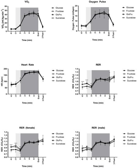 No significant differences between Glu, Fru, GluFru and placebo were found in relative oxygen consumption, oxygen pulse and heart rate (p > 0.05). Respiratory exchange ratio showed significant differences at −3 min of fructose and GluFru compared to glucose and placebo (p < 0.05). At timepoint 0, only Fru (p < 0.0001) and GluFru (p = 0.02) were significantly higher compared to placebo. Results can be seen in more detail in Figure 4.