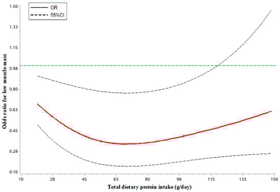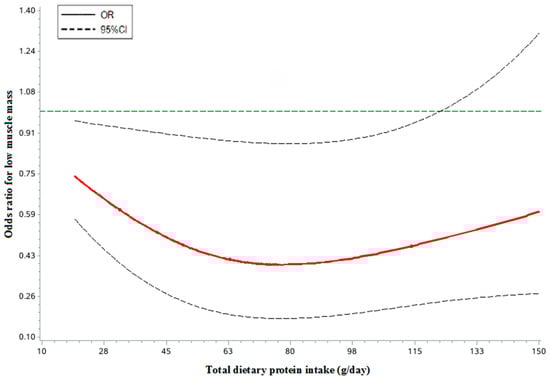 To test the dose-response association between total dietary protein intake and low muscle mass outcomes, dietary protein intake was entered in the logistic regression model as a restricted cubic spline with 3 knots (located at the 5th, 50th and 95th). The zero value of total dietary protein intake was chosen as the reference group for all spline plots. We adjusted all covariates into models, such as age, gender, education, residence area, total energy intake, BMI, total physical activity, leisure sedentary time, and diabetes. All data analyses were performed by SAS 9.4 (SAS Inc., Cary, NC, USA). Significance level was set at p value < 0.05.