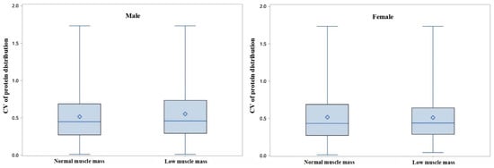As shown in Table 4, the percentage of protein intake in the morning was 25%, which was lower than that for intake at noon (36%) and in the evening (36%) among the men in the normal muscle mass group. No significant difference was found between the normal muscle mass group and the low muscle mass group in either men or women (p > 0.05). Similarly, the amount of dietary protein intake in each meal was less than 20 g, and no significant difference was found across the three daily mealtimes in different groups. Figure 3 shows that the CV of protein distribution was not significant between the normal muscle mass group and the low muscle mass group in both men and women (p > 0.05).
