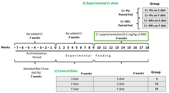 Experimental feeding consisted of two 9-week periods, i.e., initial and experimental, wherein 0.3 mg Cr/kg of body weight as chromium picolinate (Cr–Pic) and chromium nanoparticles (Cr-NPs) were added for 9 weeks of supplementation after the initial 9 week period of experimental feed without Cr supplementation. Two types of diet were applied (see Table 1): a standard-fat-and-fiber (S) diet and a high-fat–low-fiber (F) diet. The latter diet was a modification of the S diet, with 17% lard replacing maize starch and with only 3% cellulose content instead of 8%. Rats were fed with the S diet or F diet for either 9 weeks or 18 weeks.