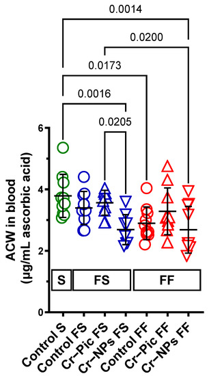 When the F diet was administered for 9 weeks, ACW did not change in the control FS group (S group vs. FS control, p = 0.7225). However, Cr–NPs decreased the ACW compared to the S group (0.71-fold, p = 0.0016), see Figure 2. A significant decrease was observed in the Cr–NPs group vs. the Cr–Pic group (0.75-fold, p = 0.0205).