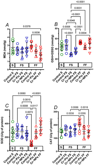 When the F diet was administered for 9 weeks, MDA did not change in the control FS group (S group vs. FS control, p = 0.9191). Neither Cr–NPs nor Cr–Pic changed the MDA, see Figure 3A.