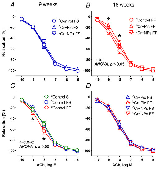 When the F diet was administered for 9 weeks, the vasodilator response to ACh did not change in the control FS group (Figure 4C). Neither Cr–NPs nor Cr–Pic changed the vasodilation (Figure 4A).