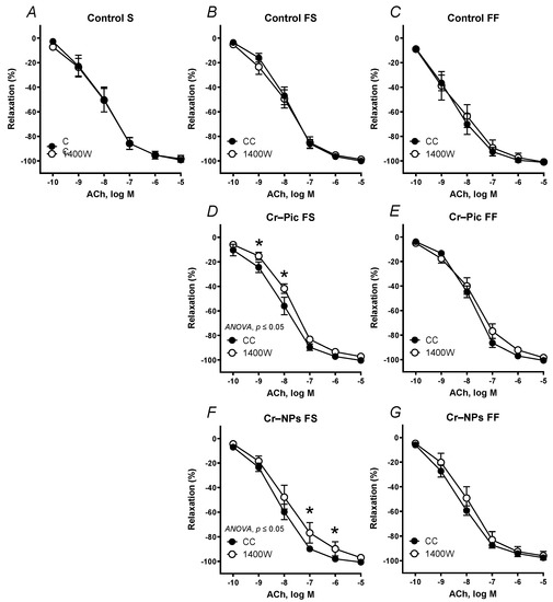 Effects of 1400 W (1 µM) on the concentration–response curves to acetylcholine (ACh) in aortic rings from the following groups of rats: control S (A), control FS (B), control FF (C), Cr–Pic FS (D), Cr–Pic FF (E), Cr–NPs FS (F), and Cr–NPs FF (G). 0.3 mg Cr/kg of body weight as chromium picolinate (Cr–Pic) and chromium nanoparticles (Cr–NPs) were added for 9 weeks of supplementation after the initial 9-week period of experimental feed without Cr supplementation. Two types of diet were applied: a standard-fat-and-fiber (S) diet and a high-fat–low-fiber (F) diet. Rats at 7 weeks of age were fed with an S diet or an F diet for either 9 weeks or 9 + 9 weeks. The following groups of rats were studied: Control S, the S diet plus the S diet; Control FS, the F diet and the S diet; Cr–Pic FS, the F diet and the Cr–Pic S diet; Cr–NPs FS, the F diet and the Cr–NPs S diet; Control FF, the F diet and the F diet; Cr–Pic FF, the F diet and the Cr–Pic F diet; Cr–NPs FF, the F diet and the Cr–NPs F diet. Results (means ± SEM) are expressed as percentage of inhibition of contraction induced by noradrenaline (0.1 µM). n = 8, * p ≤ 0.05 (two-way ANOVA/Šídák’s) compared with control conditions. In arteries from rats fed with the F diet for 9 weeks, both Cr–Pic and Cr–NPs enhanced participation of NO derived from iNOS in vascular relaxation to ACh.