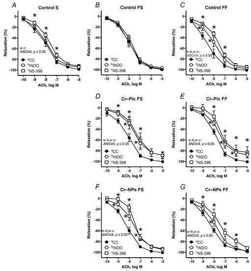 Effects of indomethacin (10 µM) and NS-398 (10 µM) on the concentration–response curves to acetylcholine (ACh) in aortic rings from the following groups of rats: control S (A), control FS (B), control FF (C), Cr–Pic FS (D), Cr–Pic FF (E), Cr–NPs FS (F), and Cr–NPs FF (G). 0.3 mg Cr/kg of body weight as chromium picolinate (Cr–Pic) and chromium nanoparticles (Cr–NPs) were added for 9 weeks of supplementation after the initial 9-week period of experimental feed without Cr supplementation. Two types of diet were applied: a standard-fat-and-fiber (S) diet and a high-fat–low-fiber (F) diet. Rats at 7 weeks of age were fed with an S diet or an F diet for either 9 weeks or 9 + 9 weeks. The following groups of rats were studied: Control S, the S diet plus the S diet; Control FS, the F diet and the S diet; Cr–Pic FS, the F diet and the Cr–Pic S diet; Cr–NPs FS, the F diet and the Cr–NPs S diet; Control FF, the F diet and the F diet; Cr–Pic FF, the F diet and the Cr–Pic F diet; Cr–NPs FF, the F diet and the Cr–NPs F diet. Results (means ± SEM) are expressed as percentage of inhibition of contraction induced by noradrenaline (0.1 µM). n = 8, * p ≤ 0.05 (two-way ANOVA/Šídák’s) compared with control conditions. In arteries from rats fed with the F diet for 9 weeks, both Cr–Pic and Cr–NPs attenuated vasodilation.