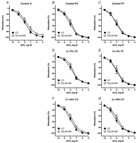 Effects of SQ-29,548 (1 µM) on the concentration–response curves to acetylcholine (ACh) in aortic rings from the following groups of rats: control S (A), control FS (B), control FF (C), Cr–Pic FS (D), Cr–Pic FF (E), Cr–NPs FS (F), and Cr–NPs FF (G). 0.3 mg Cr/kg of body weight as chromium picolinate (Cr–Pic) and chromium nanoparticles (Cr–NPs) were added for 9 weeks of supplementation after the initial 9-week period of experimental feed without Cr supplementation. Two types of diet were applied: a standard-fat-and-fiber (S) diet and a high-fat–low-fiber (F) diet. Rats at 7 weeks of age were fed with an S diet or an F diet for either 9 weeks or 9 + 9 weeks. The following groups of rats were studied: Control S, the S diet plus the S diet; Control FS, the F diet and the S diet; Cr–Pic FS, the F diet and the Cr–Pic S diet; Cr–NPs FS, the F diet and the Cr–NPs S diet; Control FF, the F diet and the F diet; Cr–Pic FF, the F diet and the Cr–Pic F diet; Cr–NPs FF, the F diet and the Cr–NPs F diet. Results (means ± SEM) are expressed as percentage of inhibition of contraction induced by noradrenaline (0.1 µM). n = 8, p ≤ 0.05 (two-way ANOVA/Šídák’s) compared with control conditions. No significant difference was observed between the analyzed groups.