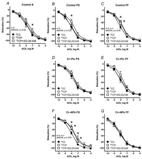 Effects of TCP (10 µM) and TCP (10 µM) plus SQ-29,548 (1 µM) on the concentration–response curves to acetylcholine (ACh) in aortic rings from the following groups of rats: control S (A), control FS (B), control FF (C), Cr–Pic FS (D), Cr–Pic FF (E), Cr–NPs FS (F), and Cr–NPs FF (G). 0.3 mg Cr/kg of body weight as chromium picolinate (Cr–Pic) and chromium nanoparticles (Cr–NPs) were added for 9 weeks of supplementation after the initial 9-week period of experimental feed without Cr supplementation. Two types of diet were applied: a standard-fat-and-fiber (S) diet and a high-fat–low-fiber (F) diet. Rats at 7 weeks of age were fed with an S diet or an F diet for either 9 weeks or 9 + 9 weeks. The following groups of rats were studied: Control S, the S diet plus the S diet; Control FS, the F diet and the S diet; Cr–Pic FS, the F diet and the Cr–Pic S diet; Cr–NPs FS, the F diet and the Cr–NPs S diet; Control FF, the F diet and the F diet; Cr–Pic FF, the F diet and the Cr–Pic F diet; Cr–NPs FF, the F diet and the Cr–NPs F diet. Results (means ± SEM) are expressed as a percentage of inhibition of contraction induced by noradrenaline (0.1 µM). n = 8, * p ≤ 0.05 (two-way ANOVA/Šídák’s) compared with control conditions. In arteries from rats fed with the F diet for 9 weeks, Cr–NPs decreased the sensitivity to ACh in arteries pre-incubated with TCP and TCP+SQ-29,548.