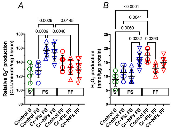 In arteries from rats fed the F diet for 9 weeks, relative O2.− production did not change in the control FS group. However, both Cr–Pic (1.22-fold) and Cr–NPs (1.20-fold) increased the relative O2.− production. This was not observed when the F diet was administered for 18 weeks (Figure 9A).