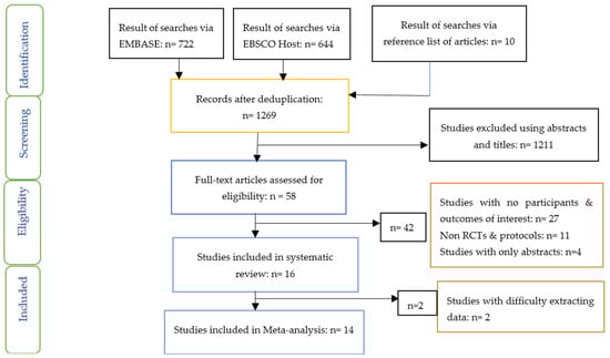 EBSCOHost was searched for relevant articles using the Health Sciences Research Databases (which includes MEDLINE, APA PsycArticles, Academic Search Premier, CINAHL Plus with Full Text, Psychology and Behavioral Sciences Collection and APA PsycInfo databases). Furthermore, EMBASE and Google Scholar were additional databases searched. The reference lists of articles were searched for studies that were relevant to the research question. The searches were carried out from database inception to 15 August 2022. The Population, Intervention, Comparator, Outcomes, Studies (PICOS) tool was used to define the research question and establish the search strategy [29]. The search terms included synonyms and medical subject headings and these were combined with Boolean operators (OR/AND) (Table 1). OO and OOO conducted the searches separately and these were cross checked by X.W. and JB. Search results were transferred to EndNote (Analytics, Philadelphia, PA, USA) and duplicates of articles were deleted.