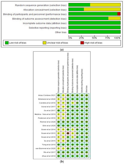 Figure 2a,b show the risk of bias graph and risk of bias summary, respectively, of the studies in this review. There was low risk of bias in relation to incomplete outcome data (attrition bias), selective reporting (reporting bias), blinding of participants and personnel, and other bias in all the studies. Nine of the 16 studies demonstrated unclear risk of bias with respect to random sequence generation, while 11 studies demonstrated unclear risk of bias in relation to allocation concealment. In terms of blinding of outcome assessments, there were 3 studies with unclear risk of bias.