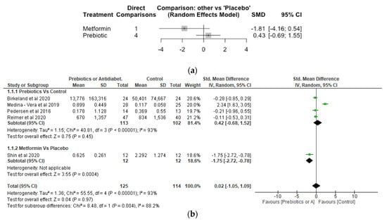 Network Meta-analysis (a) and Meta-analysis (b) of the effect of treatments versus control on Akkermansia [41,42].