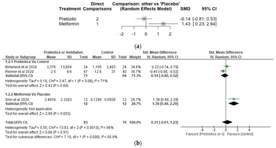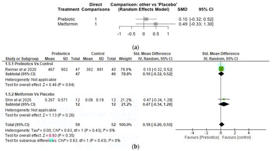 The Network meta-analysis for Akkermansia included 2 studies, 111 participants and 3 treatments. Both metformin and prebiotic treatments increased the relative abundance of Akkermansia, although the effects did not differ significantly (p > 0.05) compared to placebo (Figure 5a). The SMD was 0.10 [95% CI, −0.32, 0.52; p = 0.64] for prebiotic and 0.49 [95% CI, −0.33, 1.30; p = 0.24] for metformin treatments, respectively, compared with placebo. The results of the meta-analayis did not show any significant difference (p > 0.05) between the prebiotic and control, and metformin and control (Figure 5b).