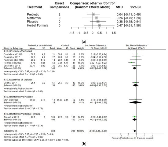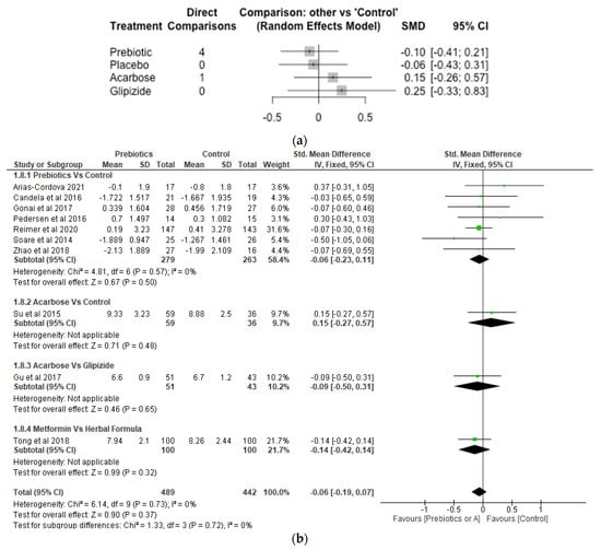 The Network meta-analysis for HbA1c included 12 studies, 7 treatments and 1012 participants (number of observations). Compared with control, glipizide, herbal formula and metformin treatments reduced HbA1c although the difference was not significant (p > 0.05). In contrast, prebiotic treatment significantly reduced HbA1c compared to control with a SMD of −0.43 [95% CI, −0.77, −0.08; p = 0.02] (Figure 6a). The results of the meta-analysis demonstrated prebiotics significantly (p < 0.05) reduced HbA1c compared to control, whereas the differences between the other treatments and control were not significant (p > 0.05) (Figure 6b).