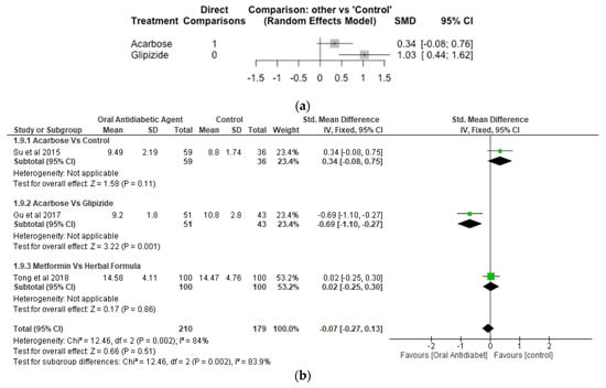 Network Meta-analysis (a) and Meta-analysis (b) of the effect of treatments versus control on Postprandial Blood Glucose [40,45,46].