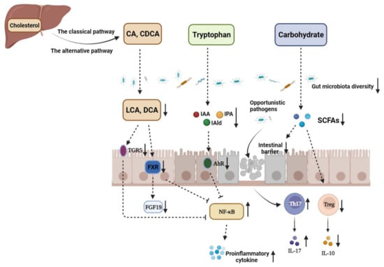 BAs are synthesized from cholesterol in hepatocytes, and there are two main synthetic pathways, namely the classical pathway mediated by CYP7A1 and the alternative pathway mediated by CYP27A1, that generate primary BAs, such as CA and CDCA. Primary BAs are stored in the gallbladder and are subsequently secreted in the gut after conjugation to glycine or taurine. They can be transformed into secondary BAs under the action of the gut microbiota [89]. Secondary BAs, such as LCA and DCA, act as high-affinity ligands for TGR5 and FXR, the activation of which exerts immunomodulatory and anti-inflammatory effects [90]. Generally, there is a balance between primary BAs and secondary Bas, but the balance can be broken by gut microbiota dysbiosis, which causes increased primary BAs and decreased secondary BAs, inducing a state of inflammation in the colon (Figure 3).