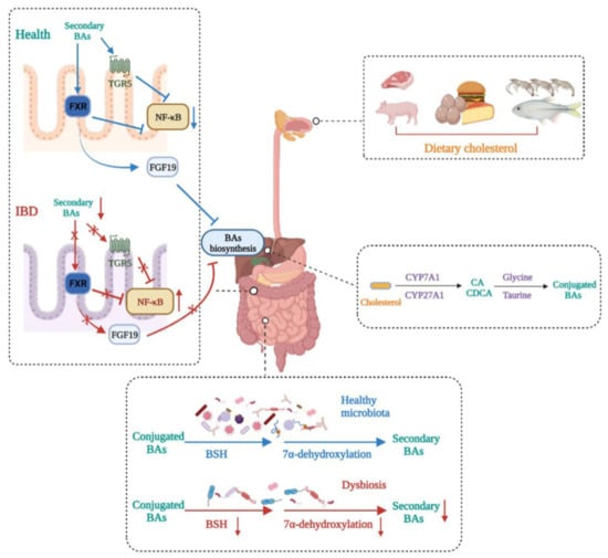 Bile acid metabolism disturbance in IBD. BA metabolism is altered in IBD patients. Dietary cholesterol is digested and absorbed in the gastrointestinal tract. Cholesterol is biotransformed to conjugated primary BAs in the liver and then secreted in the gut. Gut microbiota dysbiosis in IBD impairs BSH activity and 7α-dehydroxylation, leading to decreased secondary BAs. This induces decreases in the expressions of FXR and TGR5, which makes the transcription of NF-κB relevantly enhanced, thus aggravating IBD severity. In addition, decreased secondary BAs caused by dysbiosis reduce the production of FGF19, leading to primary BA accumulation in the liver.