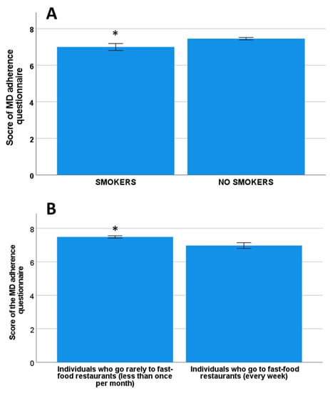 Mean score of MD adherence questionnaire in smokers and non-smokers (A) and those individuals having or not having main meals in fast-food restaurants (B). * p < 0.05.