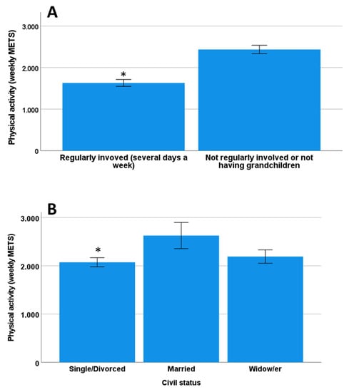 Physical activity (weekly METS) in participants involved or not in the care and parenting tasks (A) in participants according to their civil status (B). * p < 0.05.