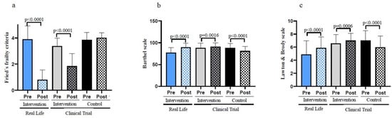 Figure 2a shows that frailty decreases significantly in the Real-Life exercise intervention. These results are even more pronounced than those achieved in the Clinical Trial intervention group []. No significant differences in the basal state of frailty were found between groups before the intervention. However, after the intervention, the Real-Life group shows higher improvements when comparted to the Clinical Trial and the Control Group (see Table 1). The clinical characteristics of the different groups of patients are shown in Table A1. This shows that most of the baseline characteristics of the patients were not altered in the different groups studied. Even if we randomly selected patients with the same characteristics, we observed that the number of falls previous to the Real-Life intervention happened to be higher than in the Clinical Trial, as was the hyperlipidemia. On the other hand, the control group seemed to have a statistically significant lower number of smokers. This is obviously a limitation of the study, but we believe that its biological significance does not hinder the validity of the results and the conclusions achieved in our study.